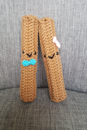 Place the eyes in the middle of the churro as shown. Using black yarn, embroider the mouth onto the front of the face with a tapestry needle, just below the eyes.